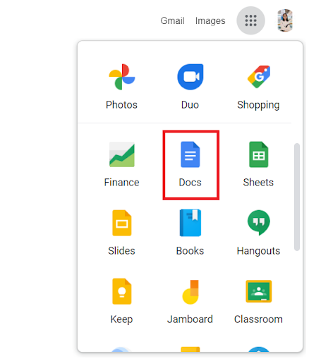 Bước 1: Vào ô vuông công cụ kế bên ảnh đại diện tài khoản Gmail. Kéo xuống chọn Docs