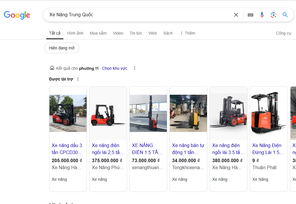 Google mua sắm khi tìm các từ khóa liên quan “xe nâng”, “Xe Nâng Trung Quốc”